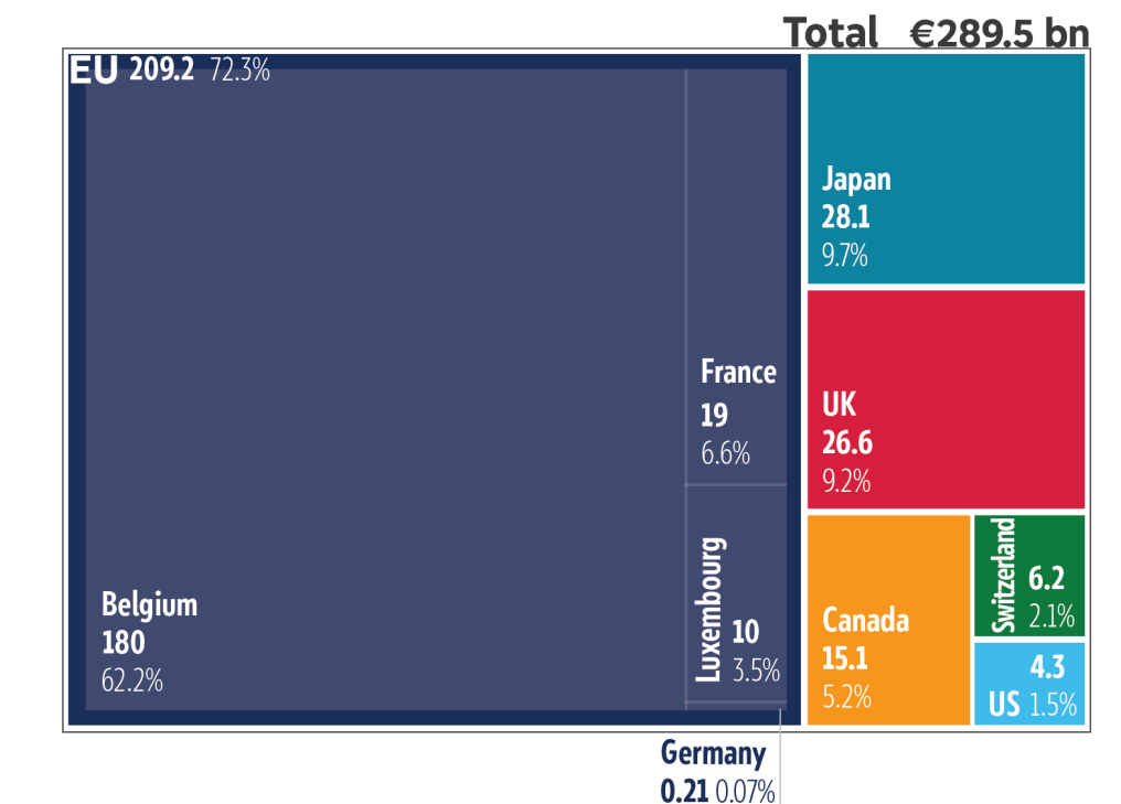 In February 2022, within days of the full-scale invasion, Western governments moved decisively to immobilise the Russian Central Bank’s (CBR) assets under their jurisdiction, marking a significant escalation from individual restrictions like travel bans. Immobilisation or freezing meant that without transferring legal ownership, all transactions related to the assets were now blocked, while interest would still be generated. The total worth of these Russian sovereign assets has an estimated value of €300 billion worldwide [figure 2]. Crucially, a huge portion of these assets, €180 billion according to Bruegel, are managed by Euroclear, a Brussels-based securities depositary that is partially owned by the Belgian federal government, which holds a 12% stake.
